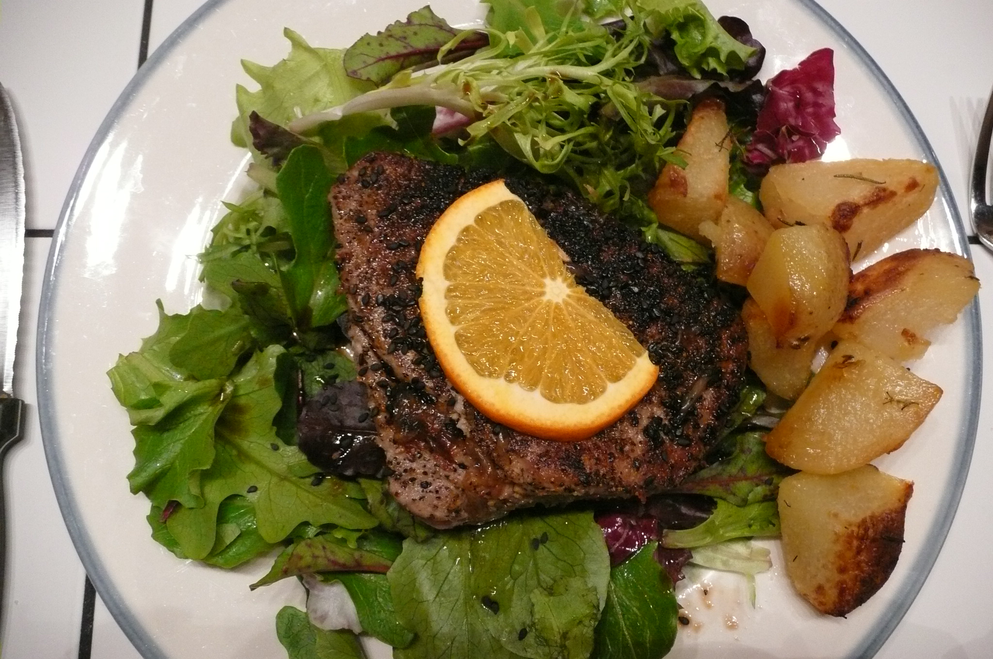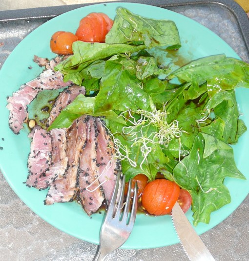 The ahi steak is sliced and placed on top of a bed of fresh greens or spinach leaves and drizzled with dressing, and black sesame seeds sprinkled on top.