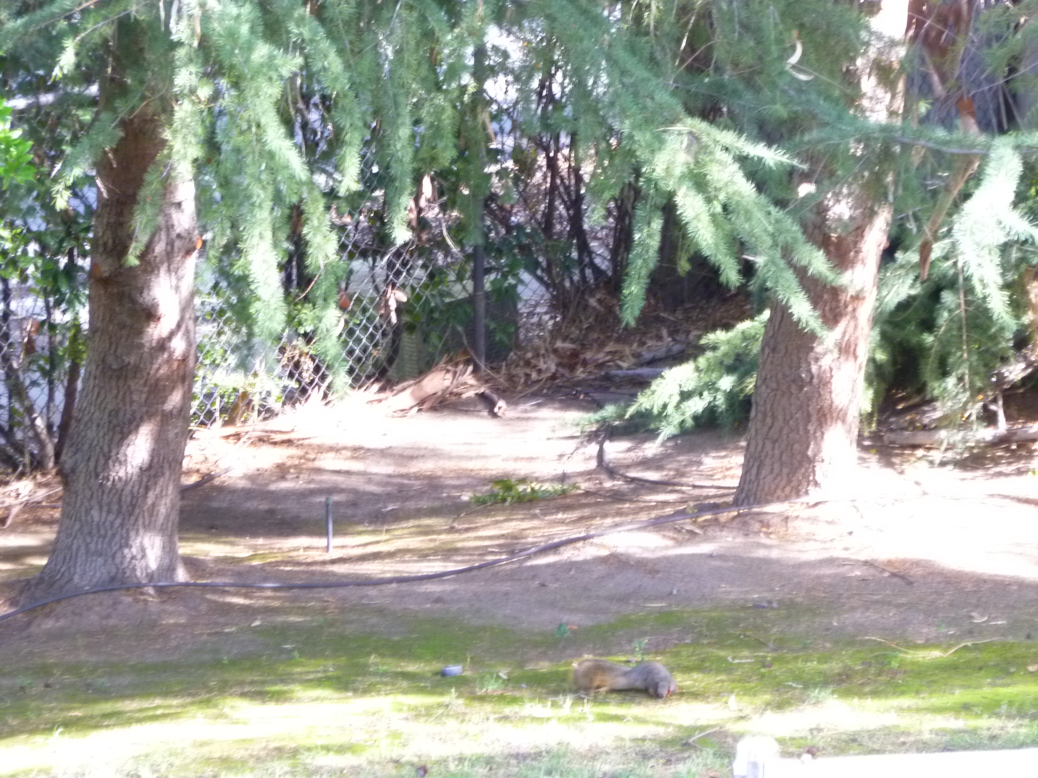 With my rifle NOW armed, I monitor the tall walnut and pine trees in the backyard. Birds are chirping their little hearts out. Including Quasi. Why can’t I shoot the birds? That wouldn’t be animal abuse, would it? Nah, birds are too pretty. They and I can co-exist. Movement on the ground! Not only we got visitor, this one trespasses! Not my problem if it didn’t see the “No Tresspassing” sign post. It runs outside along the gate, knows exactly the gap between the gate and the fence, and comes running towards the walnut trees.