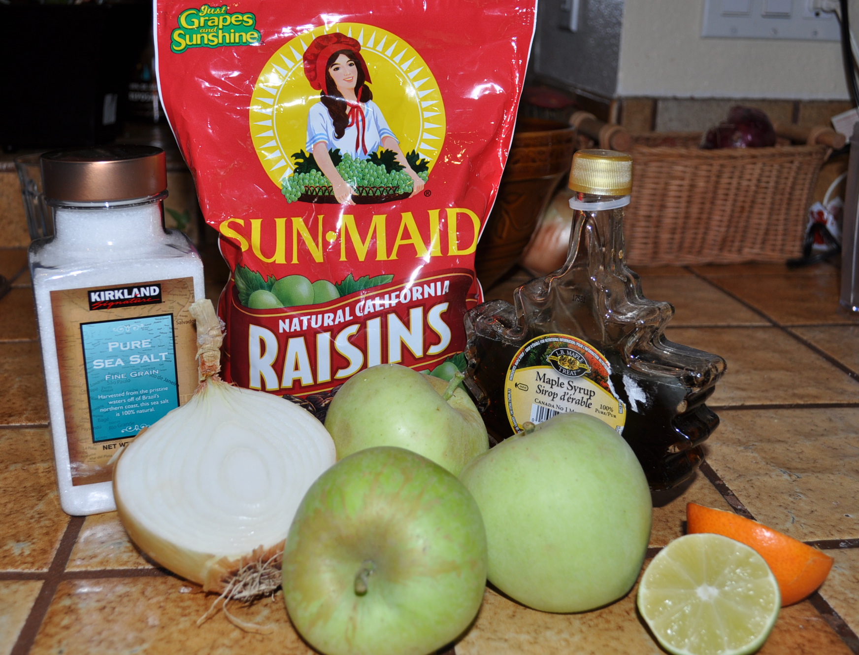 Heat 1 T olive oil in saucepan. Add cut up onions and lightly caramelize. Add skinned and cut up apples (Golden Delicious is best, but any kind is good), 1/2 c of raisins, 2 T maple syrup (can sub with 1 T brown sugar), pinch of salt, 1/2 cup of water o broth. Let all simmer for 15 minutes, until the sauce is thickened.
