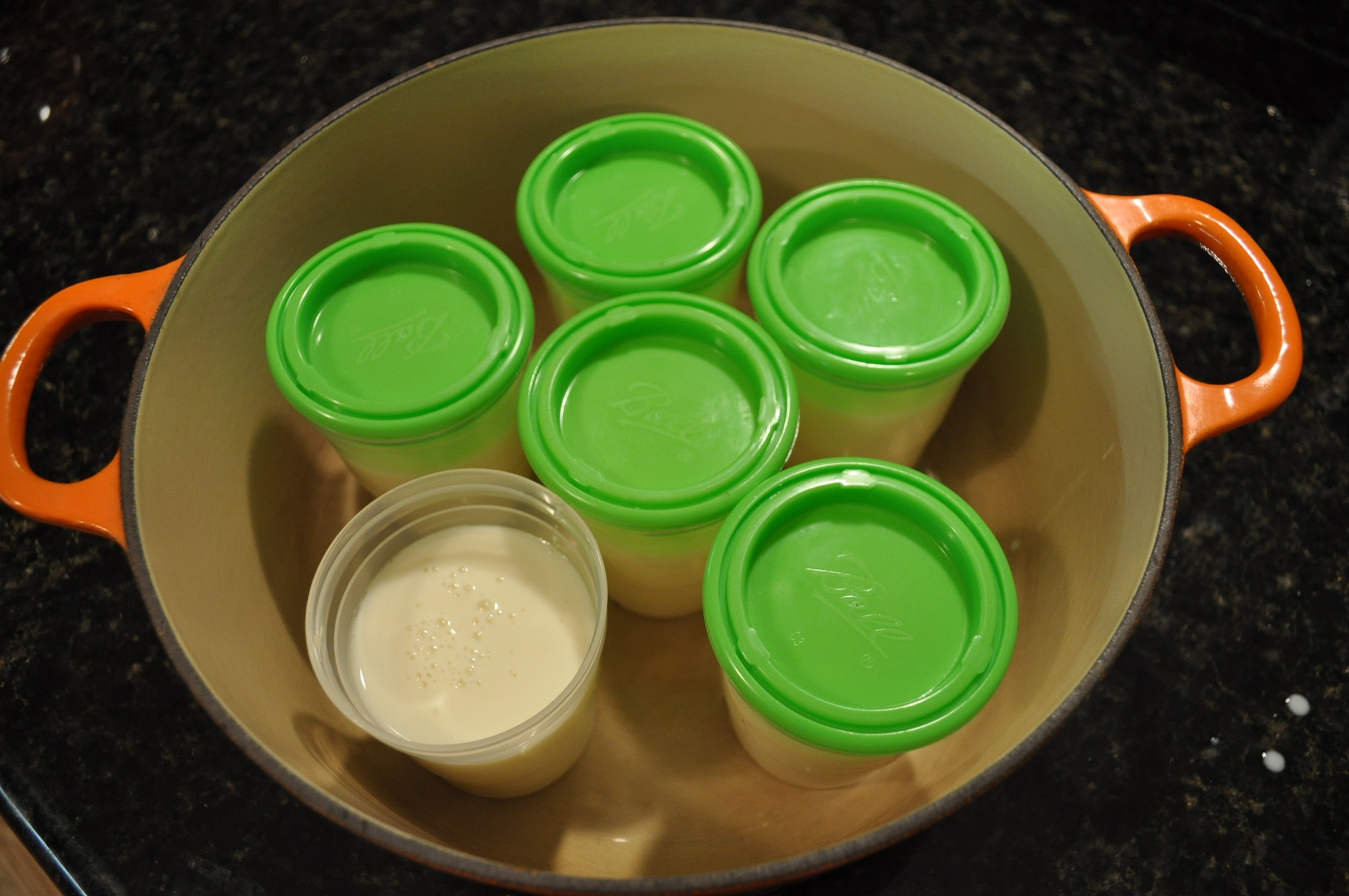 Divide up into 6 cups and place these in a deep pot. Pour hot water to the yogurt level. Cover the pot. Let the yogurt sit overnight. Refrigerate them the next day.