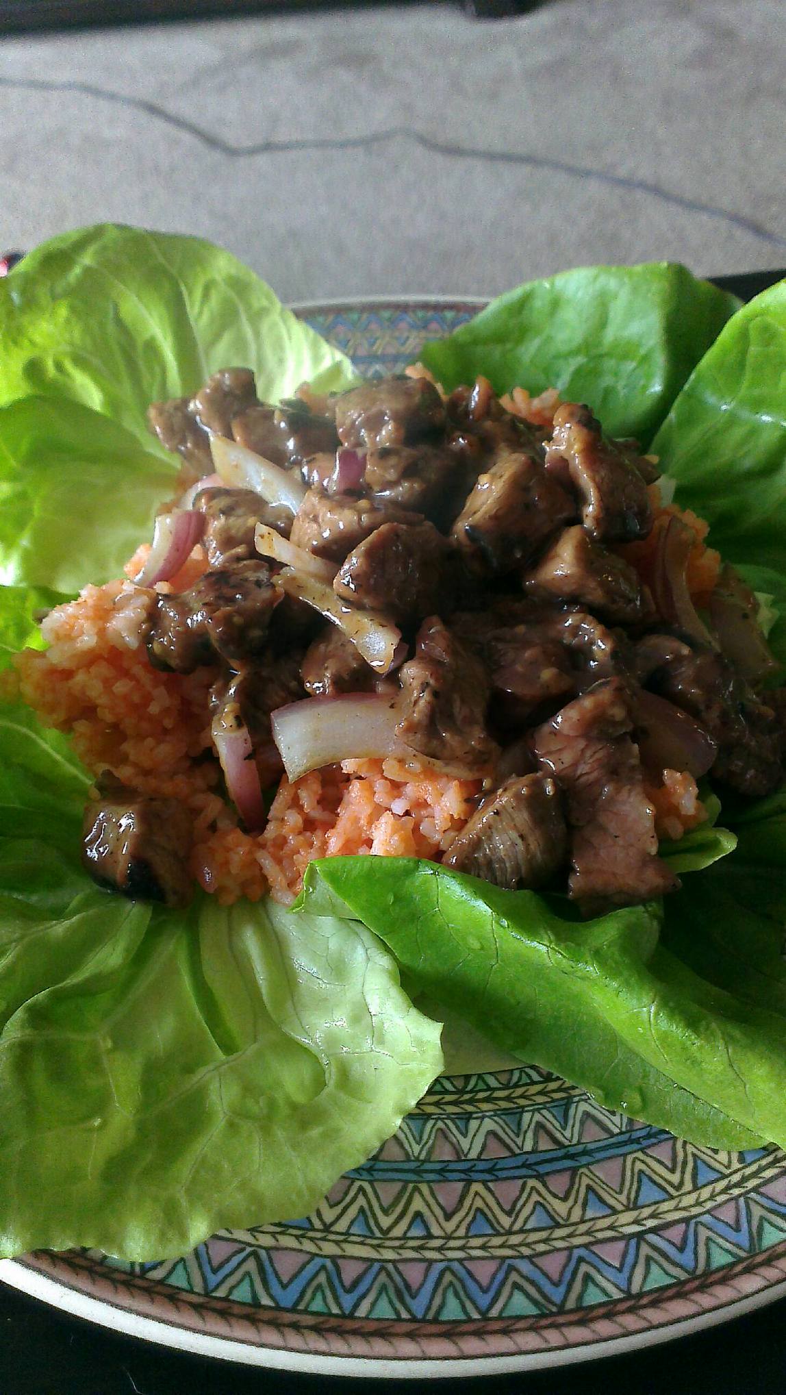 Add the beef on top of the lettuce, and the onion on top of the beef. Serve with rice (red rice!).