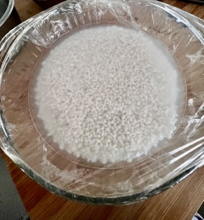 Rinse again. Place rice in a microwavable bowl. Add enough water to cover the rice and again a dash of salt, and 1 T of oil. Cover the bowl with plastic film.