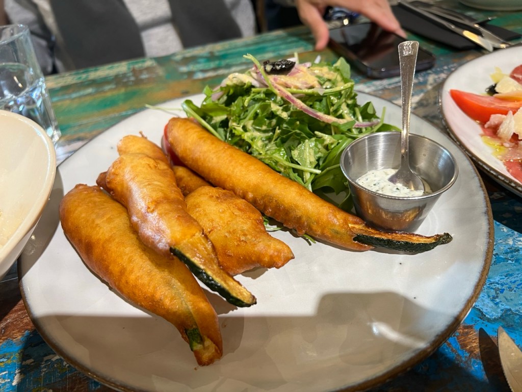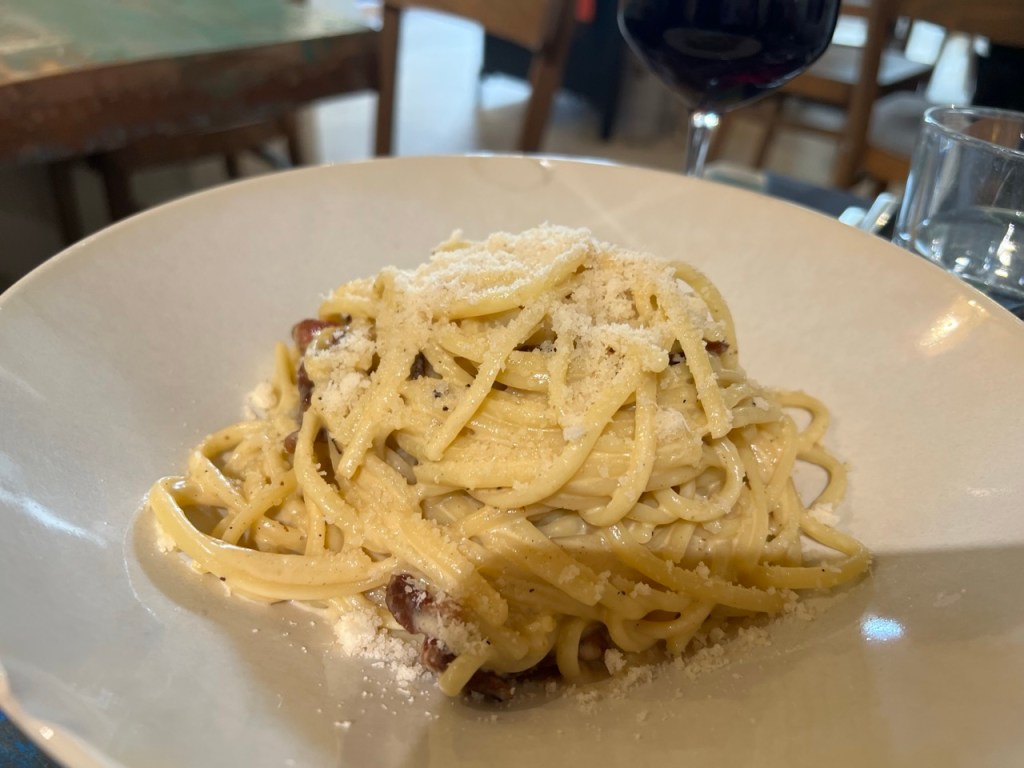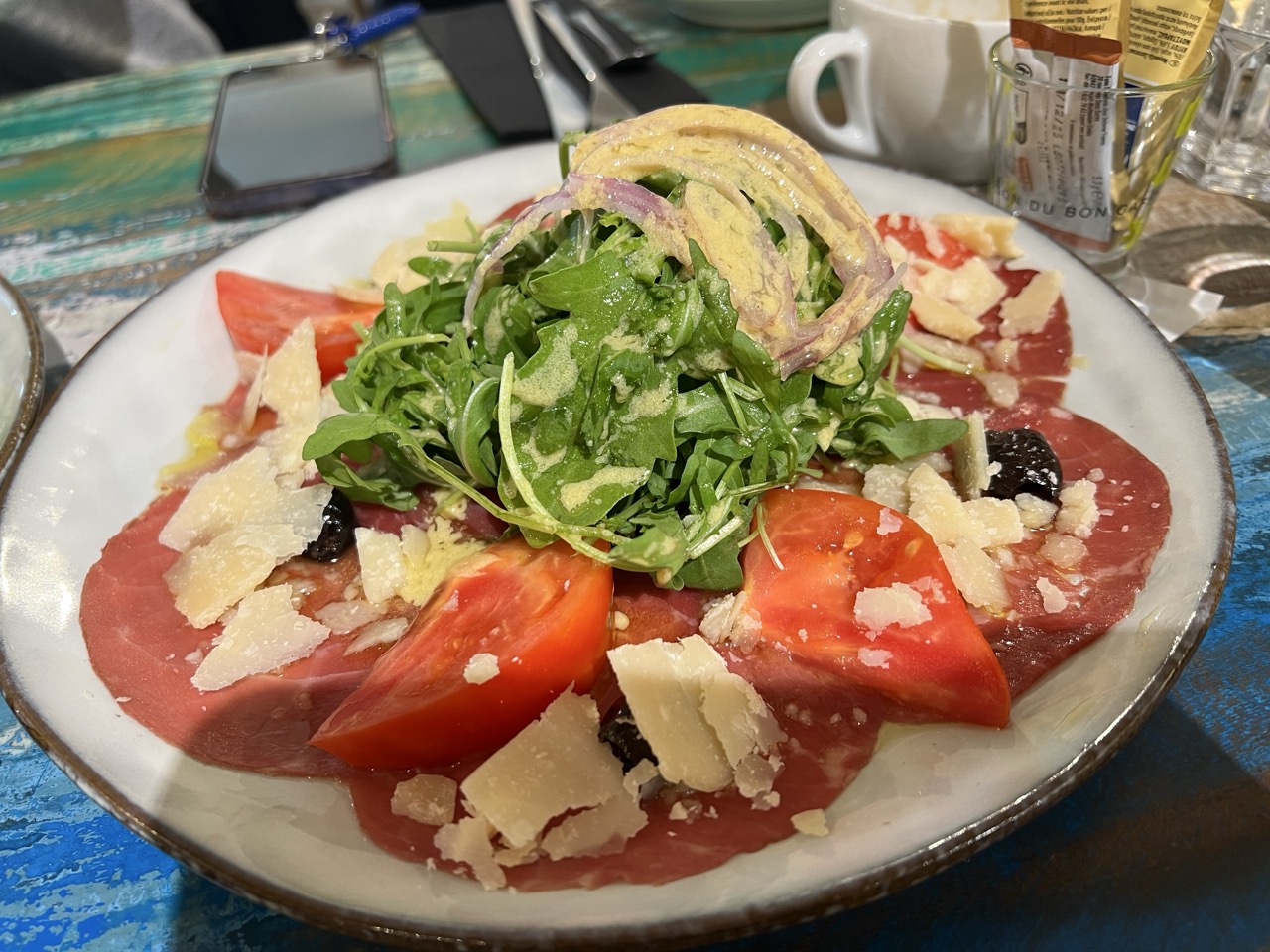 We had lunch at this 5* place where, for the first time, we had an unfriendly waitress. Lots of flies there too, everyone seems to remember that. We ordered Carpaccio of Charentais beef, Gardianne de Taureau with Polenta, and some pasta. Gardianne de Taureau is the Provençal counterpart to Boeuf Bourguignon, and made with bull meat instead of beef.
