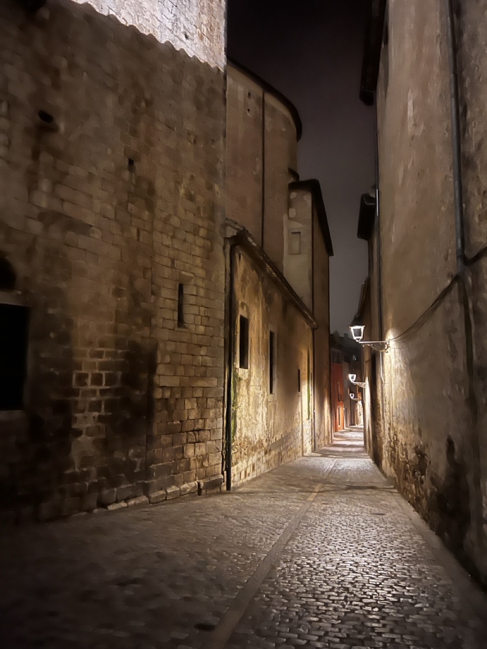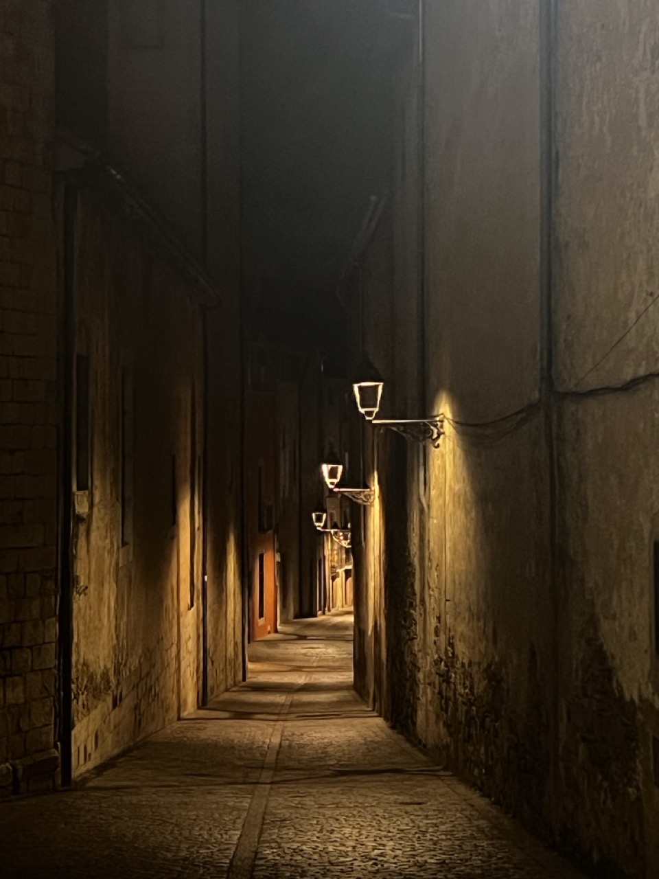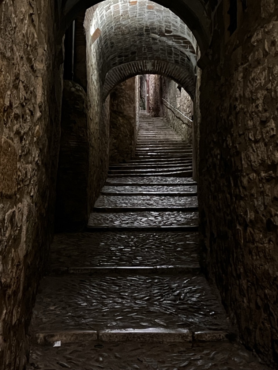 The narrow walkway from the airBnB to the Old Town is about 2 arm-length wide, just enough for a small car to go through. There are many side streets crossing the main walkway, all with stairs. There are also hidden courtyards behind doors and porticos.