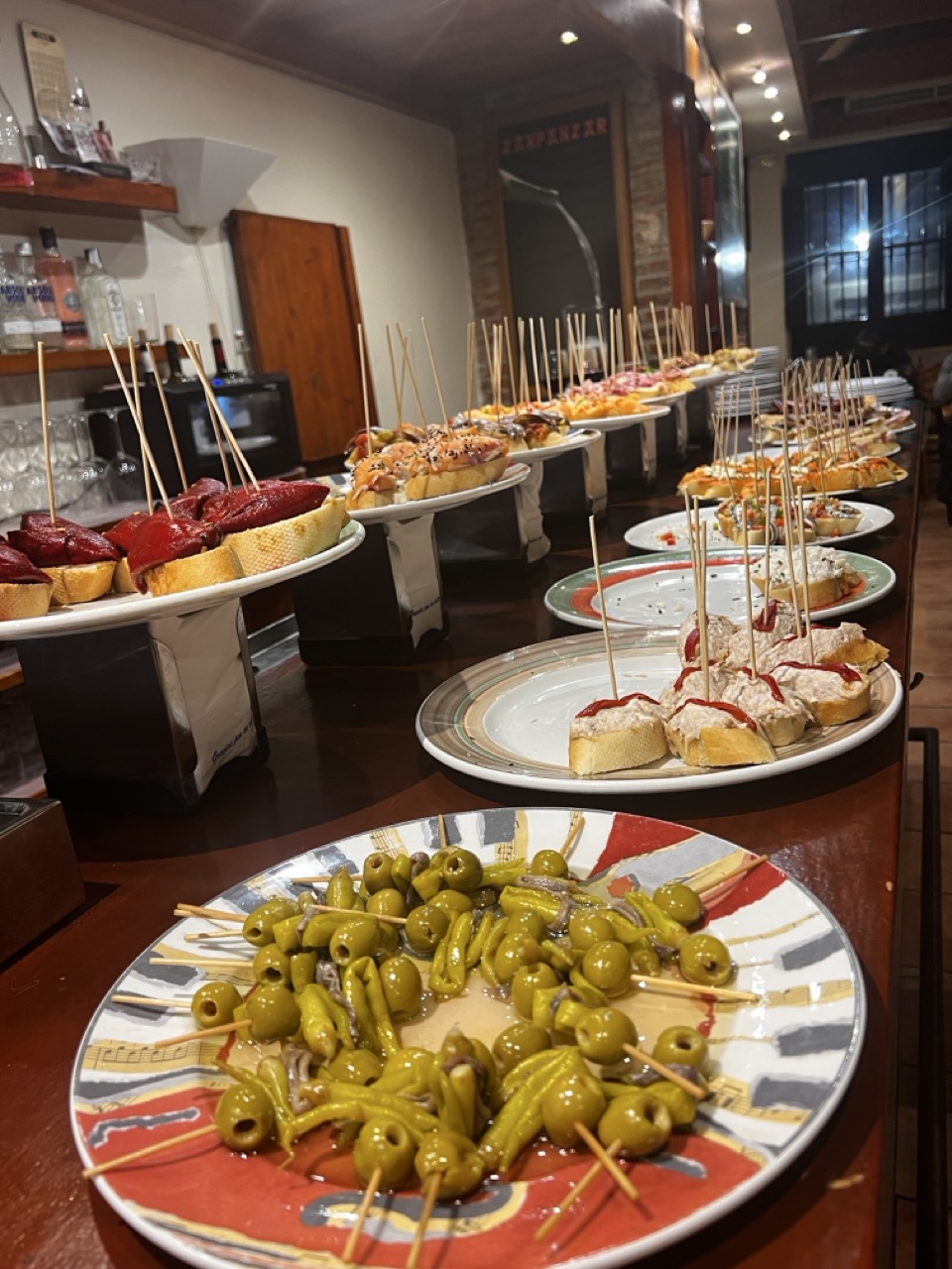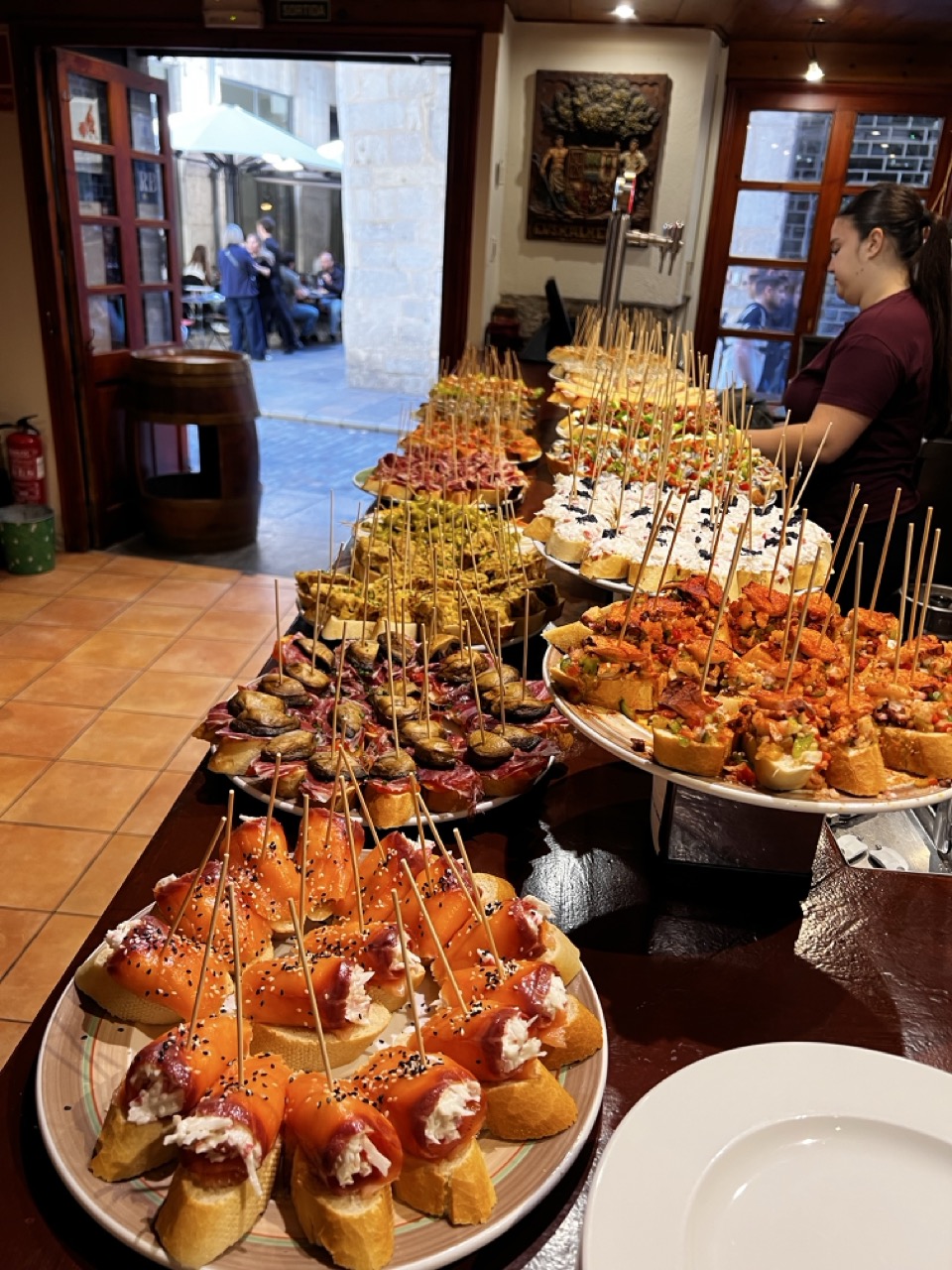 Restaurants and cafes in Girona are at least 1/3 less expensive than in Occitanie. After eating French food for 6 weeks, I welcomed the mediterranean flavors. We had tapas a few nights, hung out at bars for house vermuts every night. For lunch, we frequented 365 Cafes where a chicken and brie sandwich, a large glass of pressed orange juice, a cafe au lait bombom cost us 11 €. Tapas are 2.70€ for long sticks, and 2€ for short sticks. Sangrias are 3.50€ a glass.